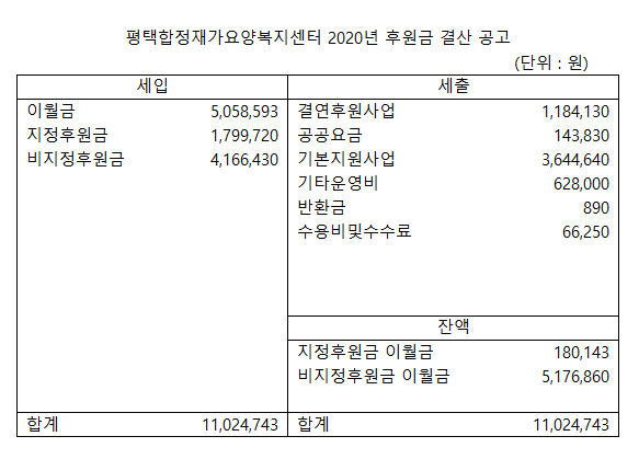 2020년 평택합정재가노인센터 후원금 결산 공고 페이지 정보 작성자 평택합정재가노인센터 작성일21-01-18 10:21 조회14,741회 댓글0건 관련링크 이전글 다음글 목록 본문 2020년 후원금 수입 지출 견산 공고 합니다. 이전글 다음글 목록
