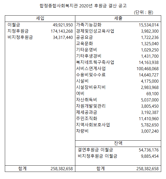 2020년 합정종합사회복지관 후원금 결산 공고 페이지 정보 작성자 합정종합사회복지관 작성일21-01-18 11:01 조회14,820회 댓글0건 관련링크 이전글 다음글 목록 본문 2020년 후원금 수입, 지출 결산 공고 합니다. 이전글 다음글 목록