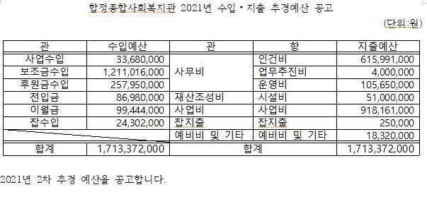 2021년 합정종합사회복지관 2차 추경 예산공고 페이지 정보 작성자 합정복지관 작성일21-12-25 10:54 조회13,688회 댓글0건 관련링크 이전글 다음글 목록 본문 합정종합사회복지관 2차 추경예산을 공고합니다. 이전글 다음글 목록