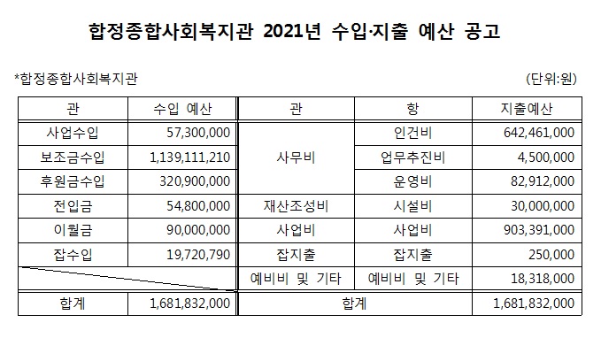 2021년 복지관 예산 공고 페이지 정보 작성자 합정종합사회복지관 작성일21-01-07 15:32 조회14,557회 댓글0건 관련링크 이전글 다음글 목록 본문 2021년 예산을 공고합니다. 이전글 다음글 목록