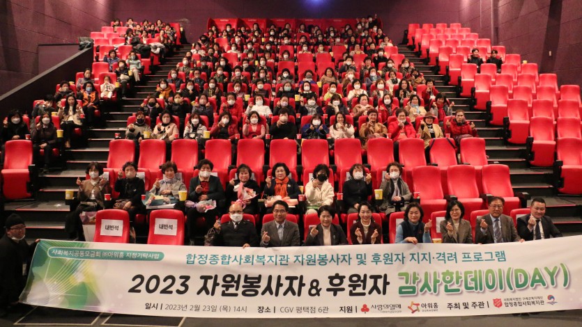 합정종합사회복지관에서는 23일, 우리 복지관과 지역사회를 위해 힘써주시는 자원봉사자 및 후원자님들을 초대하여 '2023 자원봉사자&후원자 감사한데이(DAY)' 행사를 진행하였습니다. 언제나 지역사회를 위해 배려와 나눔을 실천해주셔서 감사드리며, 앞으로도 복지관을 향한 따뜻한 관심 부탁드립니다.